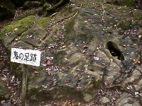 バスの運転手さんの言われた”アマノイワト”へ向けて出発。 雨がやんで晴れ間が見えてきた。 史跡”頼光の腰掛け岩”。 どこへどう腰掛けるというのだ? 続けて”鬼の足跡”。 岩に穴があいている、それだけ。 奈良の飛鳥のあたりのこんなのありましたな。 自転車借りて観て回った憶えがある。 |