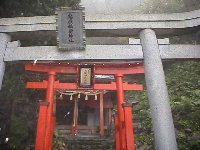 やっと鬼嶽稲荷神社に到着。 やはり人がいない。 こまかいこまかいお賽銭を入れて財布を軽くしたところで頂上をめざす。 が、途中気が変わり下山。 「雨だからぬかるんで」「他にも行く所あるから時間が惜しい」「頂上行ったからって雨霧の中何が見えるというのか」「クマが出る」 以上苦しい言い訳。 |
