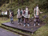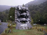 あ〜疲れた。 初めにバスを降りた場所に。 目の前に巨大な鬼瓦が出現。 そして彼方には鬼退治のパーティ(小学校のねんど細工風)が迎えてくれる。 即ちここが、”日本の鬼の交流博物館”である。 入館料¥300払っていざ入場。 人がいない・・・ ここって鬼研究のメッカ(聖地)ではなかったのか? |